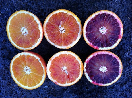 Vergelijking van enkele Tarocco’s. Van links naar rechts: Tarocco Nucellare, Tarocco Comune en Tarocco Vigo (foto van half januari)