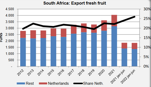 Tot vorig jaar kon Zuid-Afrika steeds meer vers fruit exporteren. In de eerste helft van dit jaar is de export echter gelijk gebleven. Gewoonlijk wordt in de eerste helft van het jaar iets minder dan de helft van het jaartotaal gerealiseerd. Nederland is veruit de belangrijkste afnemer van Zuid-Afrikaans fruit. De export naar Nederland is dit jaar wel verder gegroeid (+7%). Het aandeel van Nederland in de totale export van vers fruit uit Zuid-Afrika groeide naar ruim een kwart. Het Verenigd Koninkrijk is de tweede afnemer. In de eerste helft van dit jaar kromp de export daar naar toe met 4%.