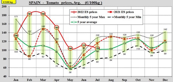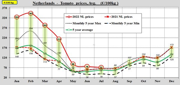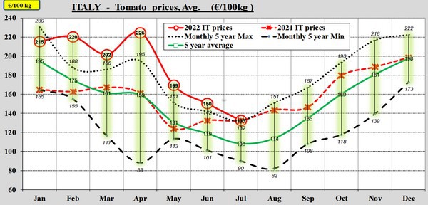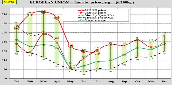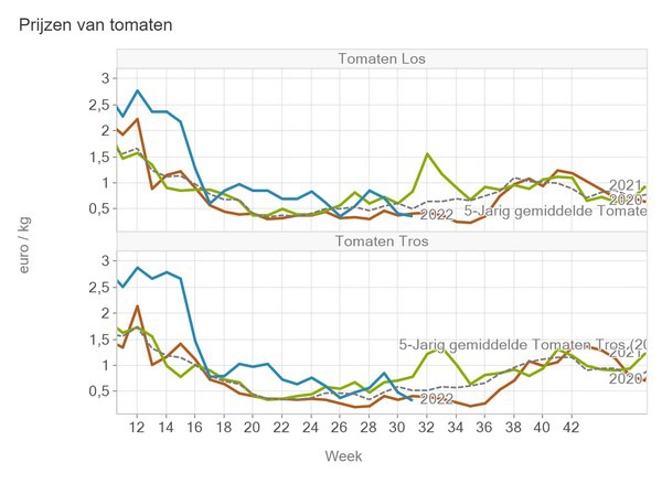 Na maanden van recordprijs na recordprijs heeft juli 2022 op de Europese tomatenmarkt geen recordprijs opgeleverd. De gemiddelde tomatenprijs kan net niet tippen aan die van juli 2021, de zomer van de 'winterprijzen', vanwege teeltproblemen en bijgevolg lagere volumes.