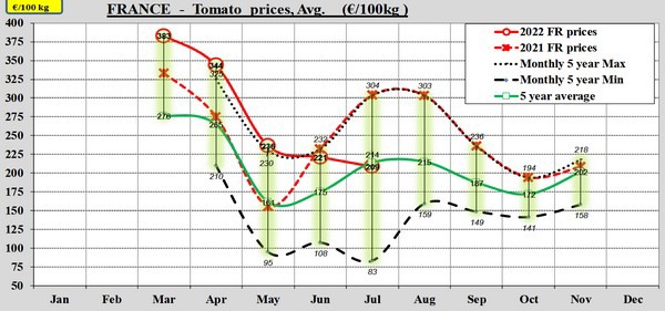 In juli zijn de tomatenprijzen in drie van de vier landen verder gezakt, tegen de trend in. Alleen in Italië zet de stijging gemiddeld genomen pas weer in augustus in. Spanje wijkt in juli 2022 het meest af van het vijfjarig gemiddelde met een daling van 6%, terwijl normaal een stijging ten opzichte van juni van 25% wordt genoteerd.
