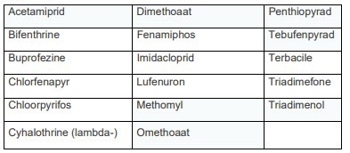 De geconstateerde MRL-overschrijdingen betreffen de volgende gewasbeschermingsmiddelenresiduen:
