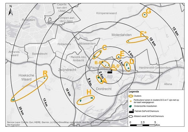 Het RIVM heeft in de gemeenten Dordrecht, Papendrecht, Sliedrecht en Molenlanden onderzocht hoeveel PFAS (Poly- en perfluoralkyl-stoffen) mensen kunnen binnenkrijgen als ze zelf geteelde groenten en fruit eten van moestuinen rond chemiebedrijf DuPont/Chemours. De moestuinen die zijn onderzocht liggen binnen een straal van 15 kilometer van dit chemiebedrijf en zijn verdeeld in negen groepen. Gewassen uit moestuinen binnen 1 kilometer van Dupont/Chemours bevatten teveel PFAS (Poly- en perfluoralkylstoffen). Het RIVM adviseert om deze gewassen niet te eten omdat effecten op de gezondheid niet kunnen worden uitgesloten. De gewassen uit een groep moestuinen die tussen 5 en 10 kilometer ten zuidwesten van het bedrijf ligt en een groep moestuinen die zo’n 15 kilometer ten noordoosten ligt kunnen moestuinhouders gewoon blijven eten.