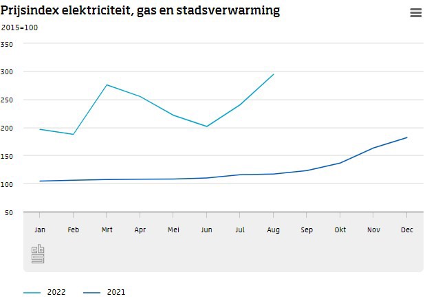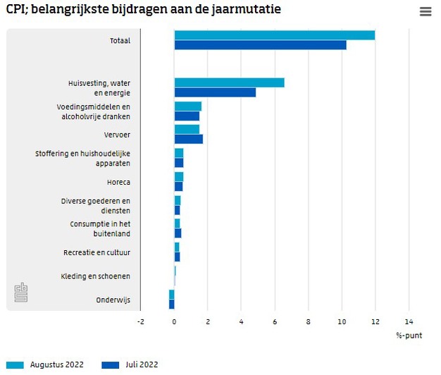 Consumentengoederen en -diensten waren in augustus 12,0 procent duurder dan in dezelfde maand een jaar eerder, meldt het CBS. Nooit eerder was de inflatie zo hoog. In juli was de inflatie 10,3 procent. Vooral de prijsontwikkeling van energie zorgde voor een verdere stijging van de inflatie.