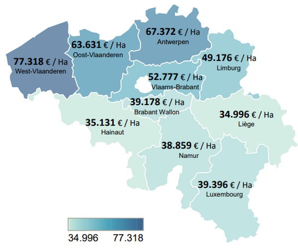 De regionale verschillen tussen Vlaanderen en Wallonië zijn nog onverminderd groot. Zo steeg de prijs met 1,5% in Vlaanderen tot €63.105 per ha en daalde het met 1,4% in Wallonië tot €37.011 per ha. Momenteel bedraagt het prijsverschil per ha tussen Vlaanderen en Wallonië dus €26.000. Maar ook tussen de provincies in Vlaanderen en Wallonië zelf bestaan grote verschillen (zie figuur 1).