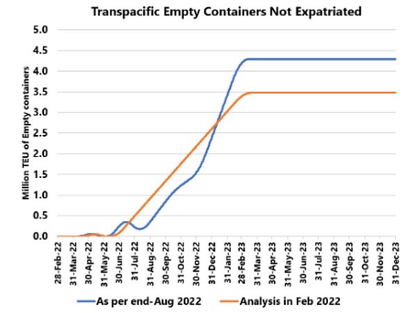 De blauwe lijn in de bovenstaande figuur toont onze huidige projectie van overtollige lege containers die in Noord-Amerika zullen vrijkomen, alleen al van de Transpacifische handel, en de oranje lijn toont onze projectie van februari 2022. Als de transporttijd begin volgend jaar weer "normaal" is, zullen er 4,3 miljoen TEU aan overtollige containers in Noord-Amerika vrijkomen, die niet kunnen worden geëxpatrieerd binnen de geplande netwerkoperaties. Dit zal mogelijk de lege containerdepots in de VS overbelasten, een probleem dat zich nu al begint af te tekenen.