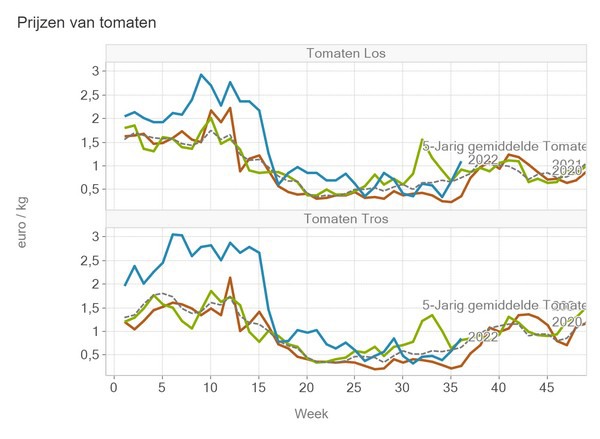 Zowel voor losse tomaten als trostomaten steeg in week 36 de middenprijs. Een kilo losse tomaten kwam uit op ruim 1,11 euro. Voor het laatst medio april werd een dergelijke middenprijs genoteerd. Ook voor trostomaten steeg de middenprijs. Over heel week 36 werd gemiddeld ruim 85 eurocent voor een kilo betaald. Ook hier stijgt de middenprijs boven het vijfjarig gemiddelde uit, maar werden ook in week 29 en tot ver in mei dergelijke prijsniveaus gehaald. Een blik op de aangevoerde volumes, bijgeleverde bij de grafiek, leert dat die lager liggen dan de afgelopen twee seizoenen en ook ruim lager dan vorige week.