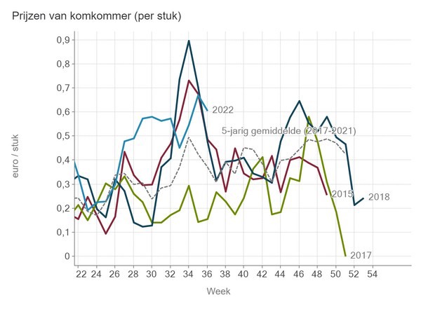 De komkommerprijzen zijn al weken hoog. Van een zomerdip is geen sprake geweest kunnen we constateren nu het meteorologische najaar is aangebroken en de schoolvakanties voorbij zijn. Met een stuksprijs van ruim 60 eurocent over week 36 liggen de prijzen ruim boven het vijfjarig gemiddelde. Alleen 2015, 2017 en 2018 kunnen met dergelijke hoge prijsniveaus in week 36 wedijveren.