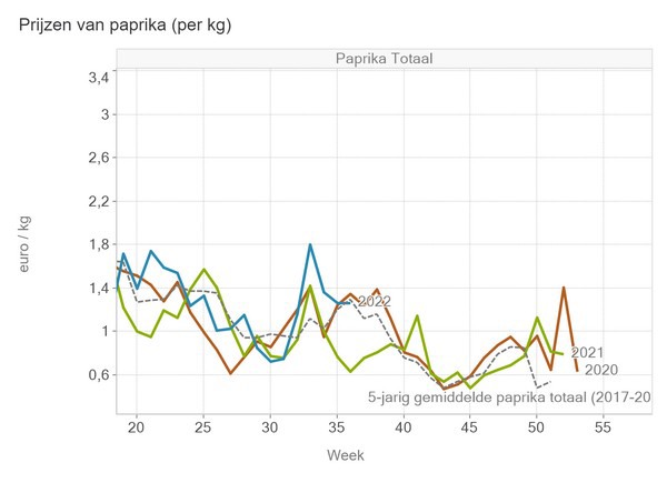 De paprikaprijsvorming is al heel 2022 moeizaam. Medio augustus werd een piekprijs genoteerd, maar daarna is de prijs weer teruggezakt tot om en nabij het vijfjarig gemiddelde. Over week 36 leverde een kilo gemiddeld 1,26 euro op. De middenprijs voor rood ligt daar met ruim 94 eurocent onder. De prijs is hier t.o.v. week 35 iets gezakt. Geel en groen worden beter betaald en laten een lichte prijsstijging t.o.v. week 35 zien.