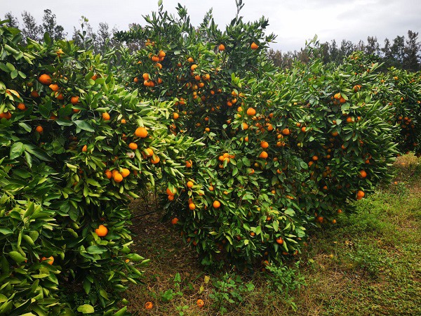Martli's eerste biologische sinaasappeloogst na de omschakeling van de volgroeide boomgaarden (rechts).