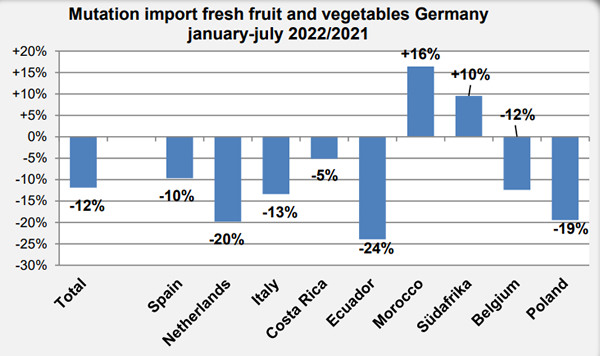 De import van verse groenten en fruit uit alle 5 de belangrijkste leveranciers was in de eerste 7 maanden van dit jaar kleiner dan vorig jaar. Spanje als veruit de belangrijkste leverancier, maar leverde 10% minder, Nederland maar liefst 20% minder, en Italië 13% minder. De import uit Costa Rica bleef “maar” 5% achter en die uit Ecuador daalde zeer fors, nl. met 24%. Er waren echter ook landen die in de eerste zeven maanden van dit jaar wel meer verse groenten en fruit aan Duitsland geleverd hebben. Het gaat hierbij om: Marokko +16%, Zuid-Afrika +10%, Peru +8% en Portugal +16%. De Duitse import uit Zuid-Afrika en Peru betreft overigens veelal re-export via Nederland. De gepresenteerde cijfers in deze analyse hebben als bron het Statistisches Bundesambt (SBA). Deze bron hanteert in principe het land van oorsprong. Dit in tegenstelling tot Eurostat: deze bron hanteert het land van herkomst (“laatste haven”).
