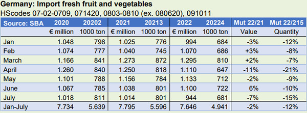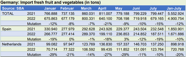 Ook in juli is de Duitse import van verse groenten en fruit weer fors achtergebleven bij dezelfde maand in het afgelopen jaar. In juli dit jaar bleef de import steken op 681.000 ton tegen 801.000 ton in juli 2021. Dat was 15% of 120.000 ton minder dan in juli 2021. Daarmee was daling van de import in juli nog wat forser dan in de eerste helft van het jaar. Over de eerste 7 maanden van dit jaar bleef de Duitse import van verse groenten en fruit 12% achter bij die in de eerste 7 maanden van 2021. Vergeleken met dezelfde periode in 2020 was het negatieve verschil nog wat groter. In waarde gezien was de import in juli ook kleiner dan in juli vorig jaar, nl. 7,65 tegen 7,80 miljard euro.
