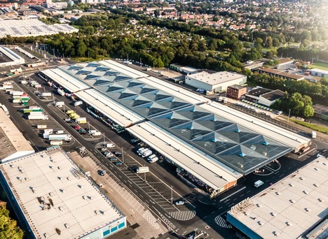 Een luchtfoto van de centrale, overdekte overslagplaats
