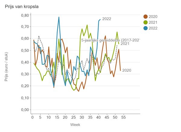 Voor de slasoorten geldt dat de meeste middenprijzen vorige week zijn gezakt, uitgezonderd multicolorsla. Ook kropsla handhaaft zich op een stuksprijs rond de 75 eurocent. Daarmee ligt de middenprijs voor kropsla heel ver boven het vijfjarig gemiddelde. Ook voor multicolorsla en veldsla ligt de prijs ruim boven het vijfjarig gemiddelde.