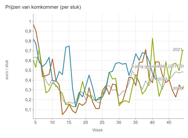 De middenprijs voor biologische komkommers vertoont geen daling. Sinds begin augustus is de prijs heel stabiel en is de prijs stukje bij beetje doorgestegen tot gemiddeld in week 41 70,7 eurocent.
