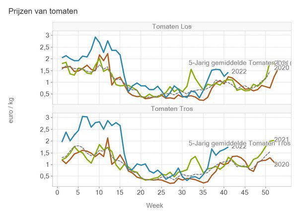 Voor een kilo losse tomaten werd afgelopen week gemiddeld afgerond 1,44 euro betaald. Daarmee is de dip in de prijs van week 40 tenietgedaan. In die week leverde een kilo 1,265 euro op, nadat de weken daarvoor de prijzen alsmaar stegen en daarna enige tijd stabiel waren. Met 1,44 lag de middenprijs vorige week weer bijna op het niveau van de tweede helft van september.