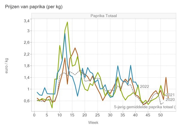 Bij de paprika's wordt geel het best betaald met in week 41 gemiddeld een kiloprijs van 1,644 euro. Groen levert gevoelig in en komt op 80 eurocent uit, terwijl ook rood iets inlevert en met afgerond 98 eurocent net iets lager ligt dan in week 40.