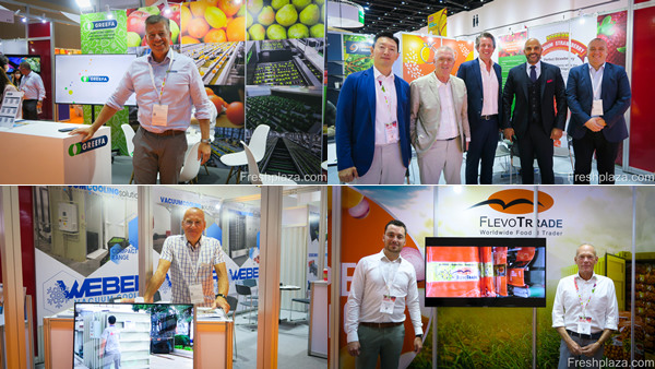 Vanaf linksboven met de klok mee: Tony Derwael van Bel'Export, Team Aartsen Asia, Fabien Dumont van FruitMasters in de Tessa-stand en Leen Droogendijk en Dirk-Jan Hartog van D-Quality Survey