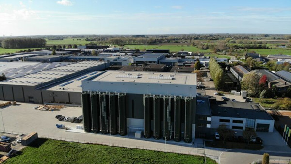 Luchtfoto van de nieuwbouw met op de voorgrond de nieuwe extrusiehal van 25 meter hoog