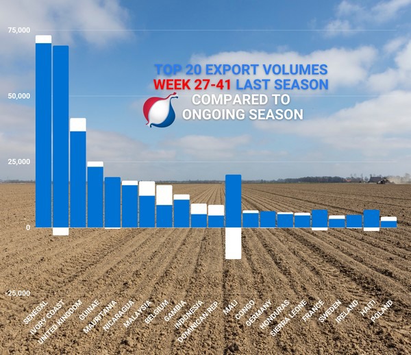 De totale export liep dit seizoen 2022/23 in de eerste vijf weken al razendsnel op tot bijna 118.500 ton. In vergelijking met vorig jaar verliet in diezelfde weken ‘slechts’ 96.000 ton onze landsgrenzen. Ook werd de ranglijst dit seizoen voor het eerst aangevoerd door Ivoorkust dat met cumulatief 30.000 ton in eerste instantie ruim voorlag op Senegal. Vervolgens maakte Senegal echter bekend dat het dit seizoen importquota afgeeft voor maar liefst 200.000 ton uien, tegenover 'slechts' 170.000 ton importquota vorig seizoen. Kort hierna nam Senegal dan ook het stokje alweer over en loopt Ivoorkust nu iets achter in vergelijking met dezelfde periode. Maar omdat er in korte tijd enorm veel Hollandse uien nar Senegal zijn verscheept, is het best mogelijk dat die markt er de rem even op zet, en Ivoorkust opnieuw op kop komt. Groot Brittannië bekleedt standvastig de derde positie en loopt qua geïmporteerd volume opnieuw stabiel en gestaag uit ten opzichte van vorig seizoen.