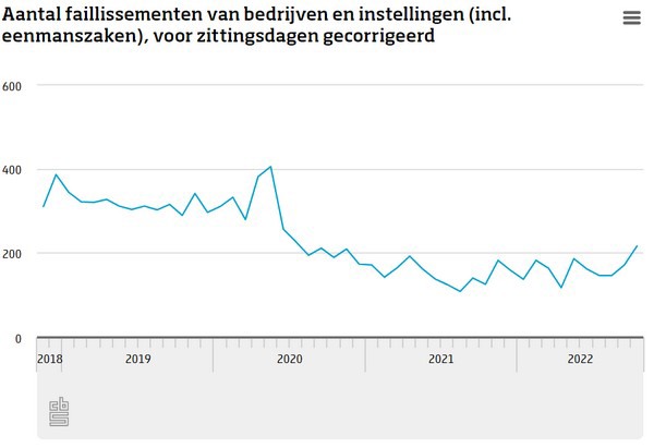 In de eerste 10 maanden van dit jaar was het aantal faillissementen ruim 10 procent hoger dan in dezelfde periode van 2021. Vorig jaar was het aantal faillissementen historisch laag.