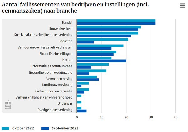 Niet gecorrigeerd voor zittingsdagen zijn er in oktober 204 bedrijven en instellingen (inclusief eenmanszaken) failliet verklaard. Van alle bedrijfstakken had de handel het grootste aantal faillissementen, namelijk 32. Dat zijn er evenveel als in september. De handel behoort ook tot de bedrijfstakken met de meeste bedrijven. In de landbouw & visserij zijn er 5 faillissementen en in de horeca moesten 14 ondernemingen haar deuren sluiten.