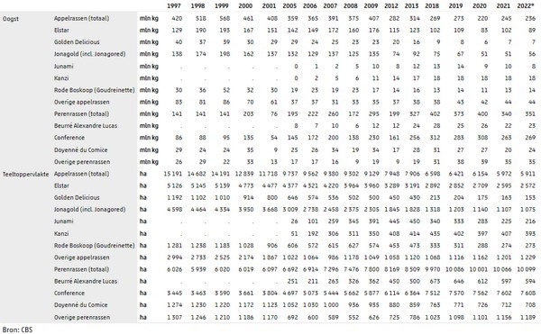 Het areaal appel en peer in Nederland is het afgelopen jaar nagenoeg gelijk gebleven. In totaal telt het CBS 5.911 ha appel en 10.099 ha peer. Het areaal peer is sinds 2021 met 33 ha toegenomen en dat van appel met 61 ha gedaald. Behalve bij Rode Boskoop daalde het areaal bij alle appelrassen, zo meldt NFO.