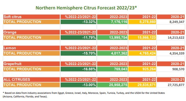 De World Citrus Organisation (WCO) heeft de jaarlijkse Northern Hemisphere Citrus Forecast voor het komende citrusseizoen (2022-23) vrijgegeven. De Forecast, die tijdens de derde editie van het Global Citrus Congress op 30 november 2022 online werd gepresenteerd, is gebaseerd op gegevens uit Egypte, Griekenland, Israël, Italië, Marokko, Spanje, Tunesië, Turkije en de Verenigde Staten (op basis van USDA-rapporten voor Arizona, Californië, Florida en Texas). Uit de Forecast blijkt dat de citrusoogst dit jaar wordt geraamd op 25.958.275 ton, wat een daling van 13% betekent ten opzichte van het vorige seizoen.