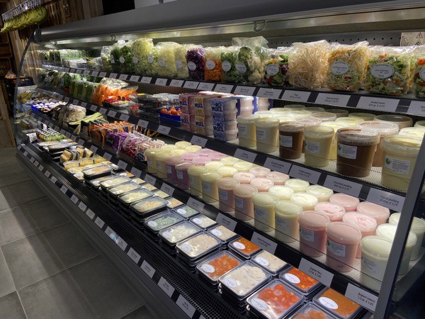 Daarnaast is er een nieuwe koeltoonbank geïnstalleerd waarin eigen gemaakte rauwkosten en salades verkocht worden en klanten worden bediend. Een bewuste keuze. “Daarom komen de mensen bij ons. Als ze zelf willen pakken, dan kunnen ze ook naar de supermarkt waar iedereen aan de tomaten zit te rammelen. Onze klanten stellen het op prijs dat wij alles netjes voor ze pakken. Een beetje zoals het vroeger gewoon was. Nu we wat meer zelfbediening hebben, heb ik ook winkelmandjes in de winkel, maar niemand gebruikt ze eigenlijk. Sommige klanten vragen zelfs of ze iets zelf mogen pakken”, aldus Claudia.