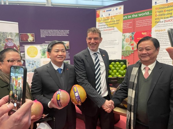 De Vietnamese minister van landbouw Le Minh Hoan bewondert de Vietnamese pitloze pomelo's voor de Europese markt