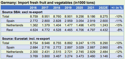 Ook de Duitse import uit de andere belangrijke leverancier Spanje zal in 2022 ver achter blijven bij die in voorgaande jaren. Volgens het Duitse Stastistisches Bundesambt is er in 2022 met 2,6 miljoen ton ruim 10% minder Spaans product in Duitsland ingevoerd dan de 2,9 miljoen ton in 2021. In 2019 en 2020 werd er zo rond de 3,0 miljoen ton Spaanse verse groenten en fruit in Duitsland ingevoerd. De import uit Italië zal in 2022 met 0,93 miljoen ton 8% achter blijven bij de 1,01 miljoen ton van 2021. Uit de dan naar omvang import volume volgende landen zal in 2022 ook minder worden ingevoerd: nl.