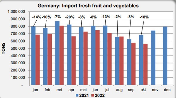 In oktober is de Duitse import van verse groenten en fruit weer fors (18%) kleiner geweest dan in oktober 2021. In de eerste 10 maanden van 2022 is de import 11% achter gebleven. Naar schatting zal de totale Duitse import van verse groenten en fruit in 2022 uitkomen op 8,3 miljoen ton. Dat is ruim 10% minder dan in 2021. Ook vergeleken met de jaren er voor werd er in 2022 veel minder ingevoerd. De waarde van import zal in 2022 met 13,5 miljard euro wel in dezelfde orde van grootte liggen als de in 2020 en 2021.