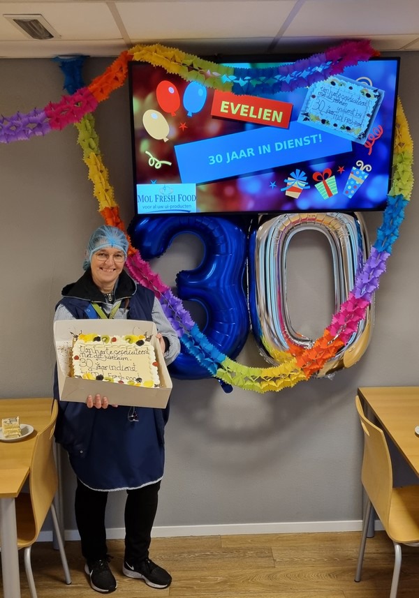 Maandag 21 november was het feest bij Mol Fresh Food. "Deze week is het 30 jaar geleden dat Evelien bij ons in dienst kwam", zo meldt het bedrijf. "We waarderen je inzet enorm. Vele duizenden kilo’s uien en sjalotten zijn al door je handen gegaan."