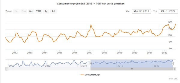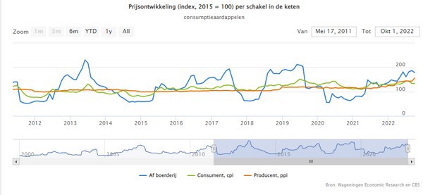 De consumentenprijsindex van aardappelen is in september 2022 uitgekomen op 134 punten (2015=100). Dat is 7% lager dan de consumentenprijs twee maanden eerder, maar 1% hoger dan in september vorig jaar. De verwachting is dat de stijgende aardappel- en producentenprijzen op enig moment ook tot hogere consumentenprijzen zullen leiden. De na corona toegenomen wereldwijde vraag door het heropenen van horeca en fastfood leidt tot een grote vraag naar aardappelproducten. Daarmee is de aardappelmarkt gekanteld. De industrie verhoogde tussentijds de contractprijzen voor het seizoen 2022-2023, ook omdat telers geconfronteerd worden met aanzienlijk hogere kosten voor gewasbescherming, diesel en bewaring (energie).