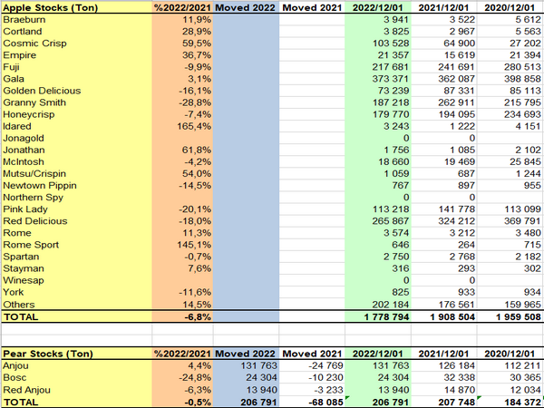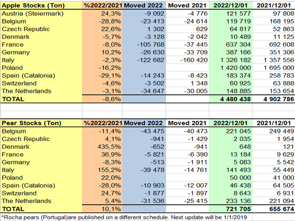WAPA maakte bekend dat de Europese appelvoorraden op 1 december 2022 4.480.438 ton bedroegen, wat een daling van 8,6% betekent ten opzichte van 2021. Deze trend kan worden verklaard door de daling van Jonagold (-23,7% ten opzichte van 2021), Jonagored (-25,2%), Gala (-17,5%) en Golden Delicious (-18,6%), waarbij verschillende rassen een daling ten opzichte van 2021 melden, met name Gloster (-66,3%) en Idared (-24,5%). Cripps Pink steeg met 29,1%, Elstar met 24,4% en Red Jonaprince met 19,2%. De perenvoorraden daarentegen steeg met 10,1% tot 721.705 ton. Abate Fetel steeg met 296,1% en Kaiser met 214,9% ten opzichte van 2021. De Portugese Rocha-peren worden volgens een ander schema gepubliceerd en zijn niet in deze cijfers opgenomen.