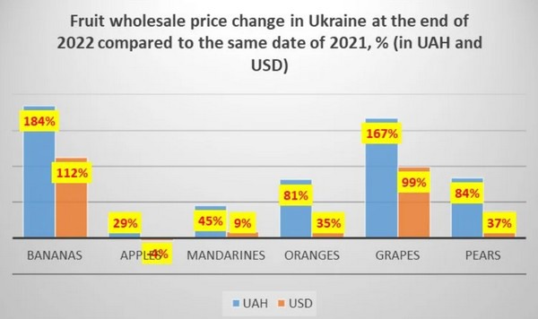 Analisten van EastFruit melden dat de groothandelsprijzen voor fruit in Oekraïne eind 2022 gemiddeld 98% hoger lagen dan eind 2021. De belangrijkste redenen voor zo'n sterke prijsstijging is het duurder worden van importfruit als gevolg van de devaluatie van de hryvnia en de stijging van de logistieke kosten als gevolg van de grootschalige invasie van de Russische agressor in het land.