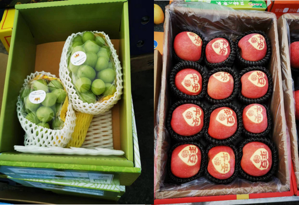 Links: Koreaanse Xiangyin druiven; rechts: appel geschenkdoos