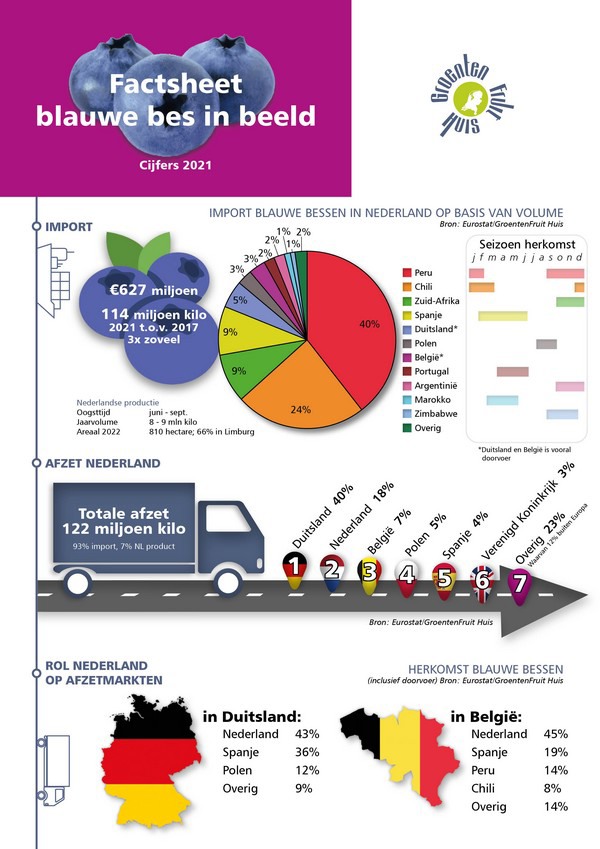 In de afgelopen vijf jaar is de consumptie van blauwe bessen in Nederland verdubbeld. Nederland speelt een hoofdrol in de internationale handel van blauwe bessen. De import verdriedubbelde in de afgelopen vijf jaar. De top-3 herkomstlanden zijn Peru, Chili en Zuid-Afrika, zo meldt GroentenFruit Huis in haar Factsheet blauwe bes