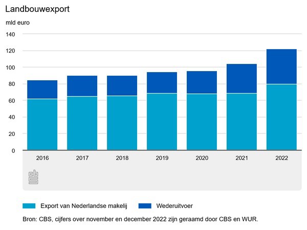 De Nederlandse economie heeft in 2022 naar schatting 49,6 miljard euro verdiend aan de export van landbouwgoederen. Daarvan is 44,9 miljard euro verdiend aan export van Nederlandse makelij en 4,7 miljard euro aan de wederuitvoer van landbouwgoederen die in het buitenland geproduceerd zijn.