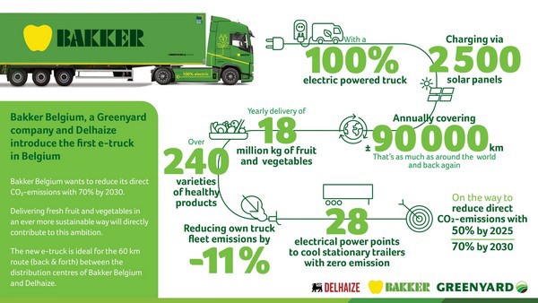 Afgelopen week vervoerde een e-truck voor het eerst verse groenten en fruit van Bakker Belgium, onderdeel van Greenyard, naar Delhaize. De nieuwe Volvo-truck zal jaarlijks ongeveer 18 miljoen kilogram groenten en fruit leveren aan het distributiecentrum van de retailer in Zellik. Met deze stap naar een duurzame vloot zal Bakker Belgium jaarlijks 58 ton CO2-uitstoot besparen.