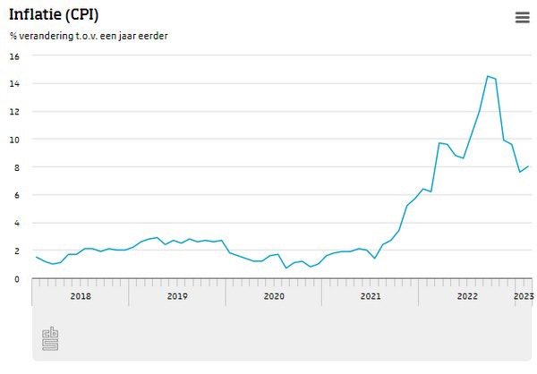 Een inflatie van 8,0 procent in februari 2023 betekent dat de prijzen van consumentenproducten 8,0 procent hoger zijn dan in februari 2022. De inflatie van 8,0 procent in februari komt dus niet bovenop de inflatie van 7,6 procent in januari.