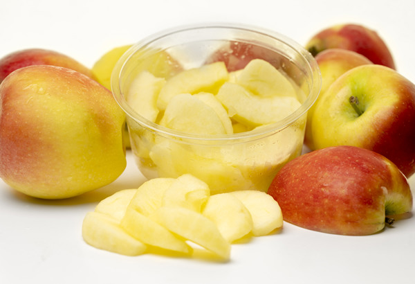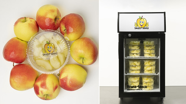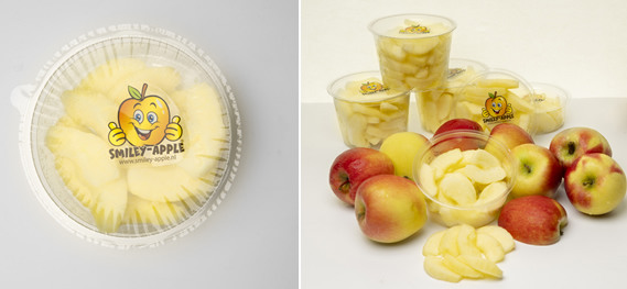 "Wij brengen onze geschilde en gesneden appelpartjes in een plastic gerecyclede cup op de markt. Deze cup bestaat voor circa 65% uit gerecycled materiaal van PET en is zelf ook weer volledig recyclebaar. We bieden de verpakkingen aan in 100, 150, 200 en 300 gram", vertelt Joery. Op de vraag of Smiley Apple ook wil uitbreiden naar andere fruitsoorten, lacht Joery: "Laten we eerst de Smiley-Apple maar eens groot maken. Wel zijn we in gesprek met Tante Fanny om de Smiley-Apple als ready-to-cook appeltaartpakket aan te bieden."