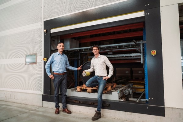 Johan Deprez (CEO) en Jeroen Deprez (Gedelegeerd Bestuurder) van Deprez bij hun eigen volautomatisch magazijn voor buitenmaatse goederen.