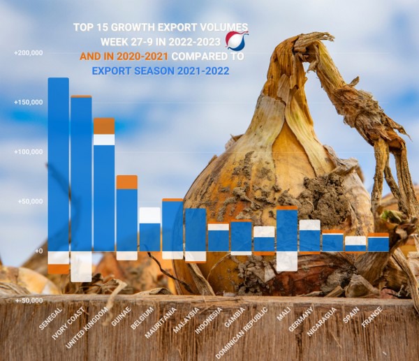 Op twee derde van het lopende exportseizoen blijkt dat de totale export met 7% achterblijft bij vorig seizoen. Op dit moment bedraagt de export ruim 935.000 ton, waarbij er in de top 3 ten opzichte van vorig seizoen wel iets is veranderd. Wat opvalt, is dat de groei in de export naar Senegal en Ivoorkust serieus achterblijft bij vorig seizoen, terwijl de export naar Groot Brittannië ongekend hoog blijft en zelfs verder met bijna 12.000 ton is toegenomen tot ruim 100.000 ton. De afname in de groei naar Ivoorkust en Senegal zal van alles van doen hebben met de uitzonderlijk hoge prijzen. Een baal Nederlandse uien van 25 kilo ligt momenteel (begin januari 2023, red.) voor ongeveer 23 dollar op de markt in Senegal. En dat is een hele forse prijs voor mensen die vaak slechts enkele dollars per dag te besteden hebben.