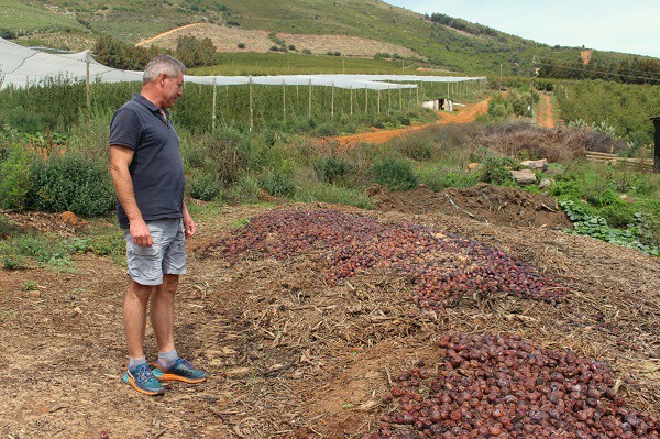 André le Grange met exportpruimen op de composthoop (foto gebruikt met toestemming van Hortgro)