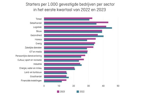 Het aantal starters groeide met 12,6 procent van 67.359 in het eerste kwartaal van 2022 naar 75.825 in het eerste kwartaal van 2023 waarbij onder andere de sectoren Horeca (29,0%), Detailhandel (25,5%) en Zakelijke diensten (21,9%). In onder andere de sectors Groothandel (-10,5%) en Land- en tuinbouw (-1,5%) nam het aantal starters het sterkst af. De grootste groei als het gaat om het aantal starters zien we terug in Flevoland (20,3%), Limburg (20,2%) en Groningen (19,1%). De kleinste groei zien we in Overijssel (8,3%).
