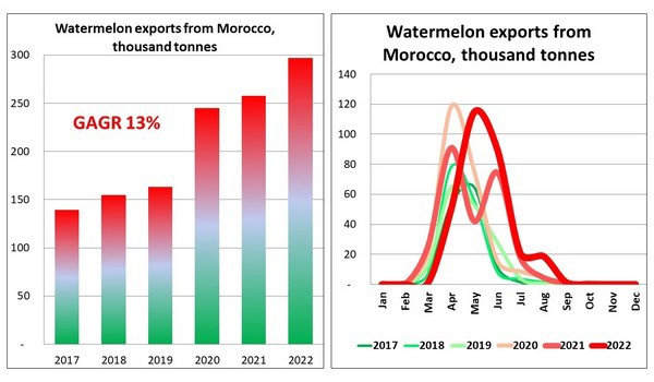 De uitvoer van Marokkaanse watermeloenen is de afgelopen zes jaar geleidelijk en gestaag toegenomen, met een gemiddelde jaarlijkse groei van 13%. De lokale producenten verhoogden het aanbod van watermeloenen in 2022 tot bijna 300.000 ton, tweemaal zo groot als in 2017. In de regel duurt de exportperiode van februari tot september, met een piek in april-mei.