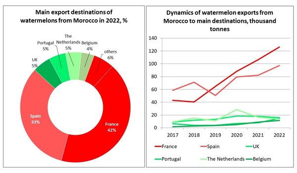 Bij de aanvoer van watermeloenen richten de Marokkaanse producenten zich traditioneel op afnemers in Europese landen. Bovendien bleken Franse consumenten de grootste liefhebbers van deze Noord-Afrikaanse watermeloenen - 42% van het totale volume wordt ingevoerd op de markten van het land, en de export naar Frankrijk is de afgelopen vier jaar verdrievoudigd. Deze groei werd ook beïnvloed door de wereldwijde trend om de consumptie van seizoensfruit buiten het seizoen te verhogen, en de ontwikkeling van exportinfrastructuur in Marokko zelf.