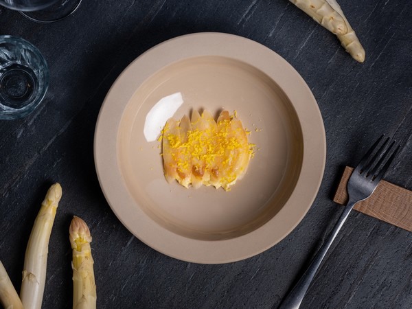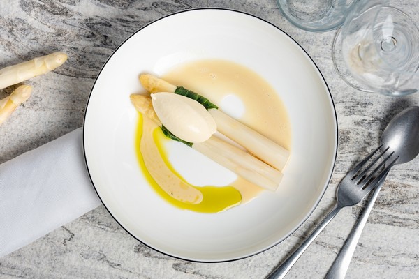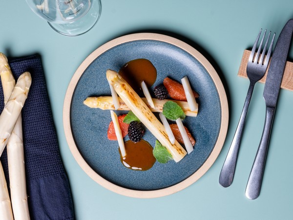 - Asperge met gebrande sjalot botersaus en ijs van asperge