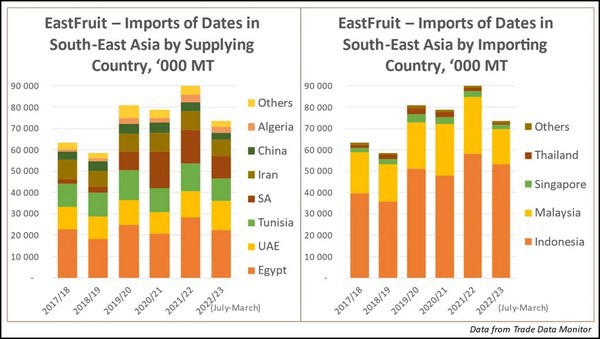 In totaal importeert Zuidoost-Azië jaarlijks 60.000 tot 90.000 ton dadels, waarbij de landen met een grote moslimbevolking de belangrijkste importeurs zijn. Indonesië en Maleisië zijn samen goed voor 90% van de totale invoer van dadels in Zuidoost-Azië.