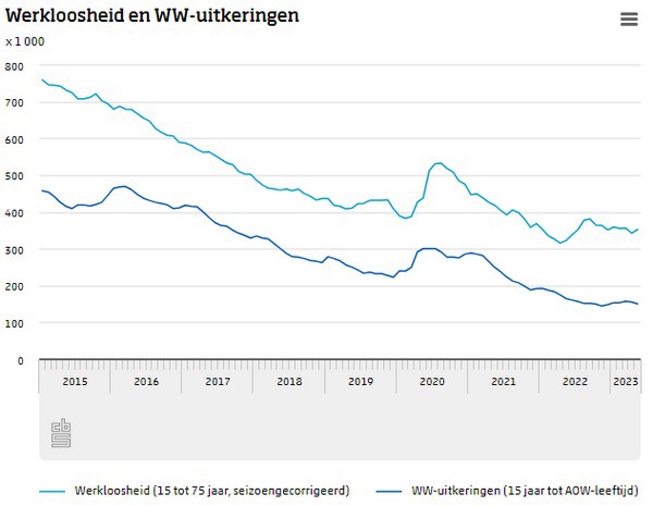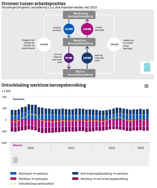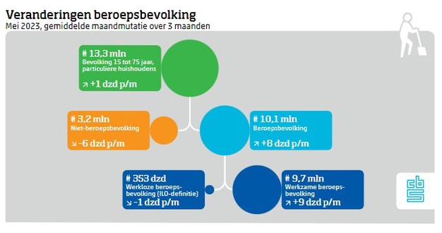 In mei 2023 waren 353 duizend mensen van 15 tot 75 jaar werkloos. Dat is 3,5 procent van de beroepsbevolking. De ontwikkeling van het aantal werklozen meet het CBS als gemiddelde verandering in de afgelopen drie maanden. In de maanden maart tot en met mei nam het aantal werklozen licht af met gemiddeld duizend per maand. Het aantal werkenden steeg in dezelfde periode met gemiddeld 9 duizend per maand naar 9,7 miljoen. UWV registreerde eind mei 151 duizend lopende WW-uitkeringen.